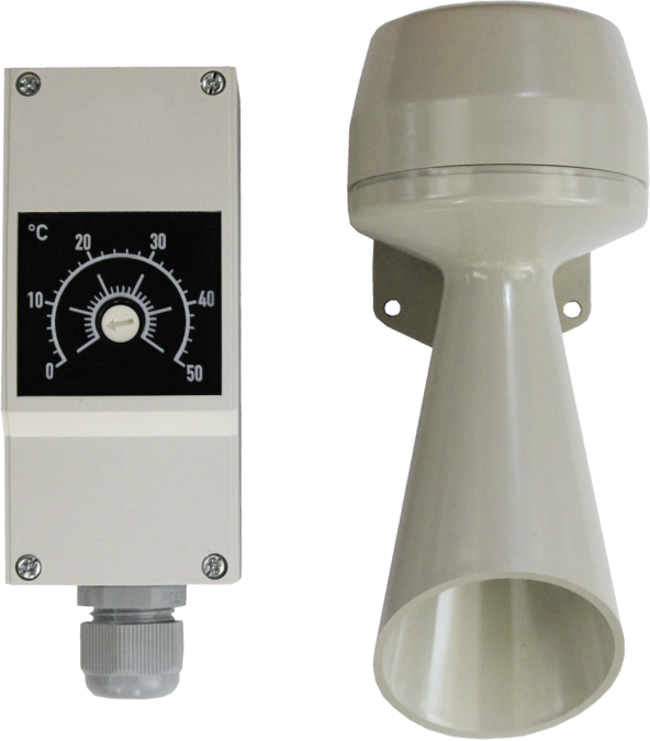 bestaande uit buisthermostaat en claxon met 230V-aansluiting, installatie op ringleiding, bij daling van de temperatuur onder bijv. +5° C klinkt de waarschuwingsclaxon en meldt zo een temperatuurval in het systeem