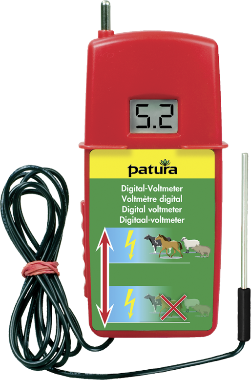 Het ideale spanningsmeetapparaat met aardpen en afrasteringcontact; digitale indicatie; onontbeerlijk voor de controle van het schrikdraadapparaat, de aarding, het zoeken naar fouten en voor de controle van de apparaten; met ingebouwd belastingsweerstand om dier aanrakingen te simuleren
