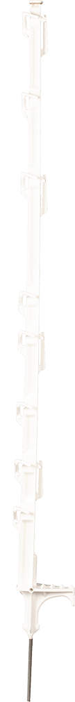 Stabiele kunststof paal met speciale draadhouders voor snelle en behoedzame draadbevestiging; 8 houders voor kunststofdraad en lint tot 12,5 mm, resp. 4 houders voor lint tot 40 mm, 1,05 m hoog, rasterhoogte 0,85 m, wit