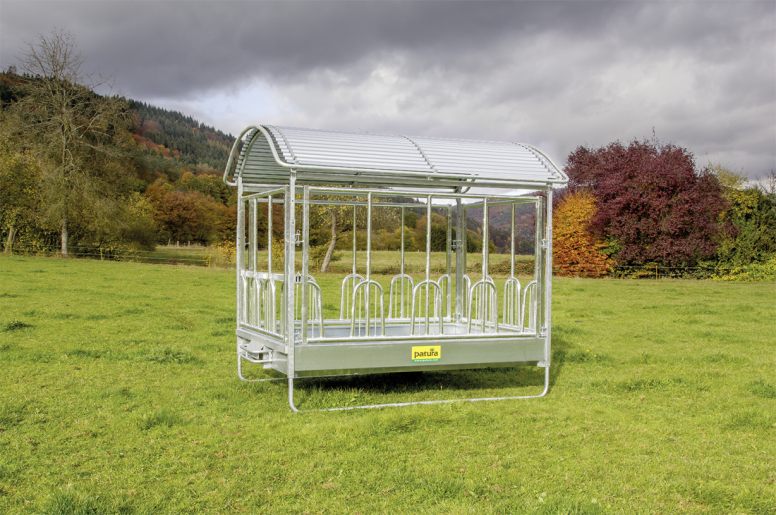 Voor 2 ronde balen of 1 grote baal, 14 voerplaatsen, voor alle paarden-en runderrassen, ook geschikt voor runderen met horens, driepuntsophanging, dubbele versterkingsbuizen, binnenmaat 2,85 x 2,05 m, voerhoogte 76 cm, dak in de hoogte verstelbaar, levering als bouwpakket met montagehandleiding