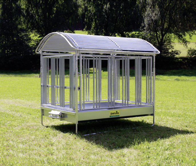 Voor 2 ronde balen of 1 grote pak, 16 voerplaatsen, halswijdte ca. 30 cm, driepuntsophanging, dubbele versterkingsbuizen, binnenmaat 2,85 x 2,05 m, voerhoogte 76 cm, dak in de hoogte verstelbaar, levering als bouwpakket met montageaanleiding