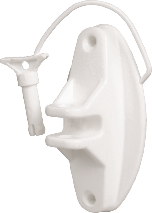 UV-bestendige, stabiele kunststof isolator; montage met schroeven; pin voor het gemakkelijk leggen van de draad; wit