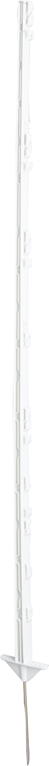 Stabiele, volledig geïsoleerde kunststof paal met ijzeren punt en dubbele intrap; 5 of 7 draad + 1 of 3 cordhouders en 1 of 2 houders voor lint tot 40 mm
