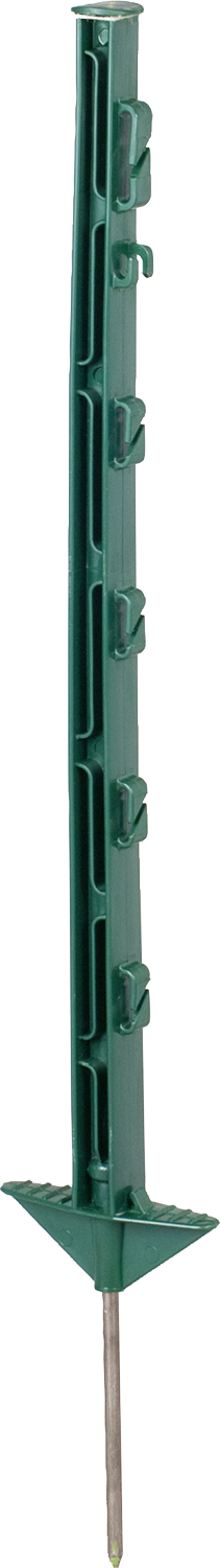 Stabiele, volledig geïsoleerde kunststof paal met ijzeren punt en dubbele intrap; 5 of 7 draad + 1 of 3 cordhouders en 1 of 2 houders voor lint tot 40 mm