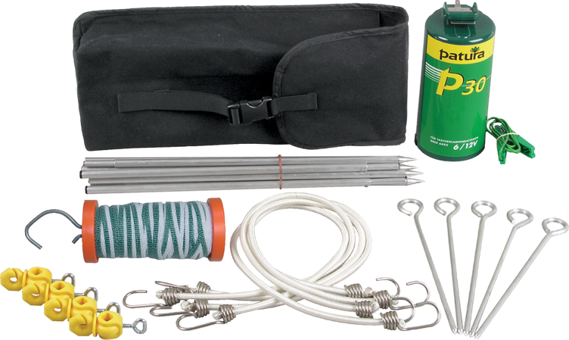 De paddock die u overal mee naar toe kunt nemen; in de set inbegrepen: P30 schrikdraadapparaat, 4 demontabele aluminium palen, 5 haringen, 5 rubberen corden, 4 isolatoren, 1 poortgreep, 40 m lint, 1 waterdichte tas; Verpakkingsmaat ca. 45 cm x 17 cm x 10 cm, gewicht 2,75 kg (incl. batterijen)