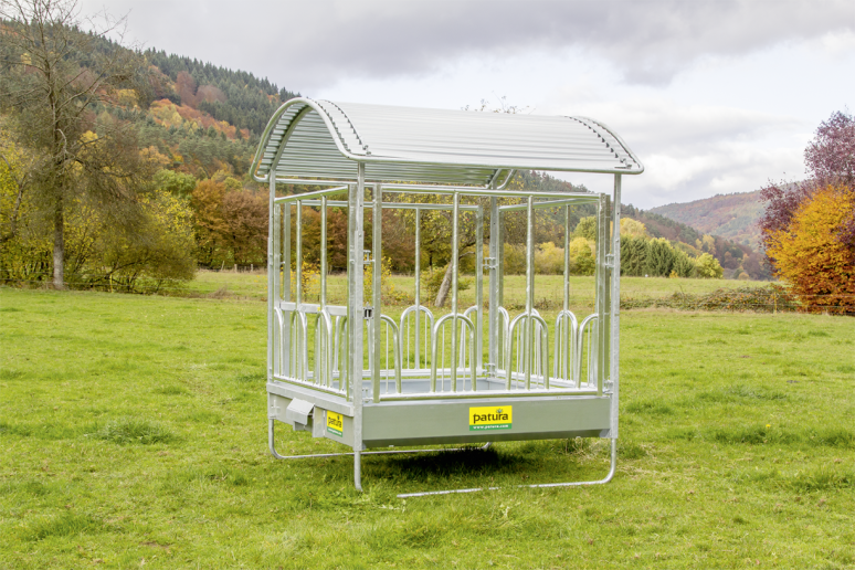12 voerplaatsen, voor alle paarden- en runderrassen, ook geschikt voor runderen met horens, driepuntsophanging, dubbele versterkingsbuizen, binnenmaat 2,00 x 2,05 m, voerhoogte: 76 cm, dak in de hoogte verstelbaar, levering als bouwpakket met montagehandleiding