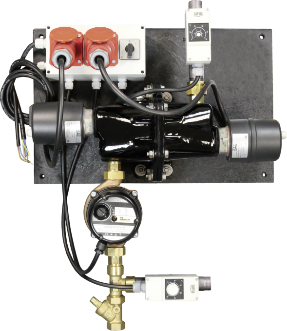 met thermostaat in retour, 2 stuks 400 V / 3 kW verwarmingsstaven, zeer krachtige circulatiepomp (400 W), terugslagventiel, terugslagklep, overdrukventiel, automatische ontluchter en hoofdschakelaar, bedrijfsklaar op bodemplaat gemonteerd, 2 FI-schakelaars 30 mA vereist volgens bouwvoorschrift, wateraansluitingen 1", lengte leiding: max. 350 m, max. hoogteverschil (aanvoer/retour) 7 m