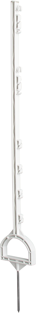 Met glasvezel versterkte, volledig isolerende kunststof paal met 6 resp. 8 draadhouders voor kunststofdraad, 20 en 40 mm lint en voor cord; metalen punt; robuuste stijgbeugel intrap voor gemakkelijk opstappen;