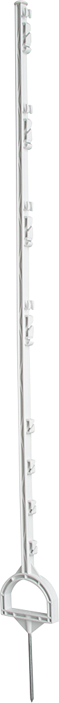 Met glasvezel versterkte, volledig isolerende kunststof paal met 6 resp. 8 draadhouders voor kunststofdraad, 20 en 40 mm lint en voor cord; metalen punt; robuuste stijgbeugel intrap voor gemakkelijk opstappen;