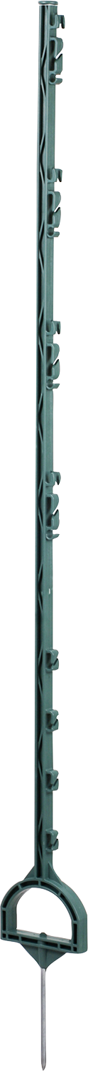 Met glasvezel versterkte, volledig isolerende kunststof paal met 6 resp. 8 draadhouders voor kunststofdraad, 20 en 40 mm lint en voor cord; metalen punt; robuuste stijgbeugel intrap voor gemakkelijk opstappen;