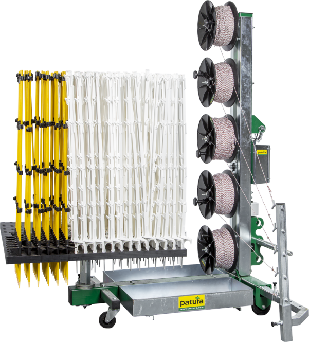 De Tornado Master 5.0 van PATURA is speciaal ontwikkeld om zo snel en efficiënt mogelijk verplaatsbare afrasteringen te plaatsen. Er kunnen maximaal tegelijk vijf rijen worden opgetrokken of gedemonteerd. Bij het plaatsen van afrasteringen worden de haspels gespannen met een vrij instelbare rem. Daarbij zorgt een elektromotor ervoor, in combinatie met de geleidingsarm, dat het geleidermateriaal veilig en gelijkmatig wordt teruggespoeld. Het verwisselbare magazijn kan worden gevuld met maximaal 400 palen. Met deze machine zijn hoge uuropbrengsten mogelijk, in combinatie met een aanzienlijk hoger comfort.