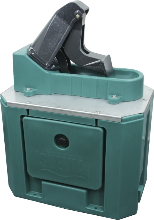 Membraan-weidepomp, gemonteerd op een dubbelwandige geïsoleerde behuizing, serviceluik zonder gereedschap te openen voor snelle toegang tot de petroleum- brander, sokkel van roestvrij staal, 6 gaten voor vloermontage, voor het verwarmen wordt er binnenin een petroleumbrander geplaatst, apart te bestellen ref. 1010550